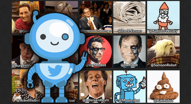 Six mutually-interactive Twitterbots based on Samson & Gert characters